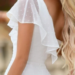 Take your event to next level ADORABLE in the Ace Mini Dress! Designed with light weight textured swiss dot detail and a one shoulder sheer flutter sleeve with a sweetheart neckline.
