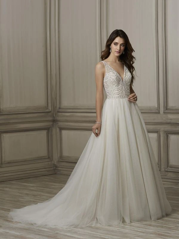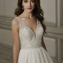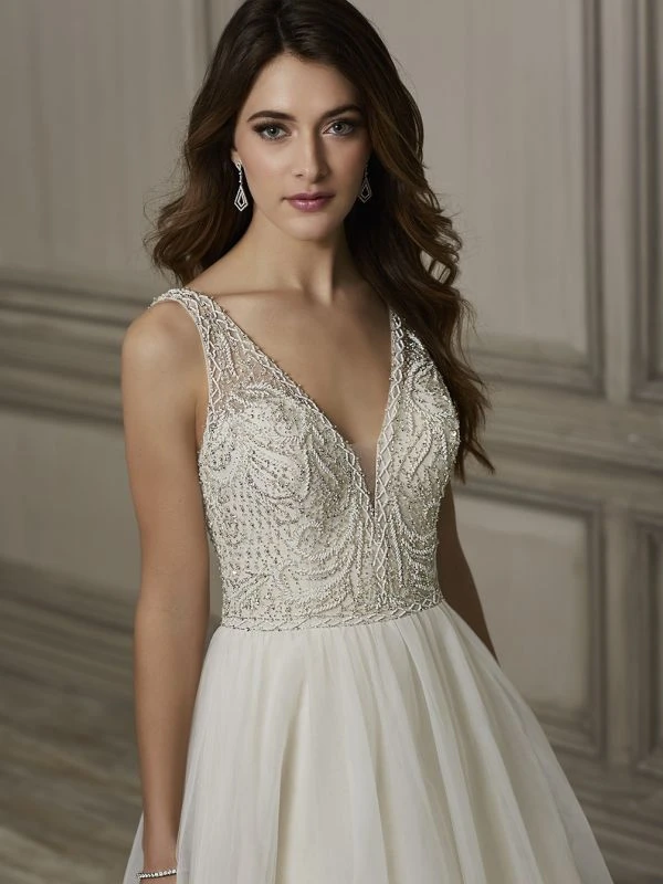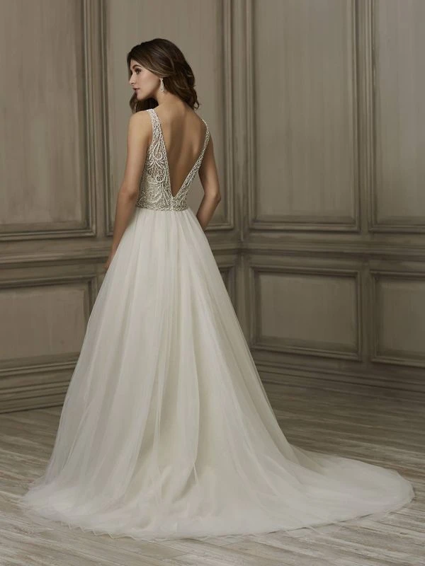 Crystal beading embellishes the sleeveless bodice with an illusion V-neckline and an illusion V-back of this Adrianna Papell Brooke tulle wedding dress. A sheer inset accents the neckline and the A-line skirt cascades in lightly gathered layers, finishing in a sweep train.