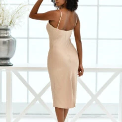 The Aspen Midi Dress in Champagne Satin is the perfect style for an upscale event, be it worn as a wedding guest dress, cocktail party dress or social occasion.