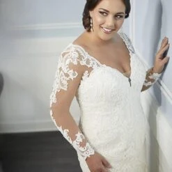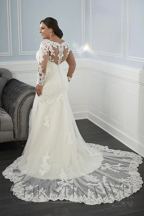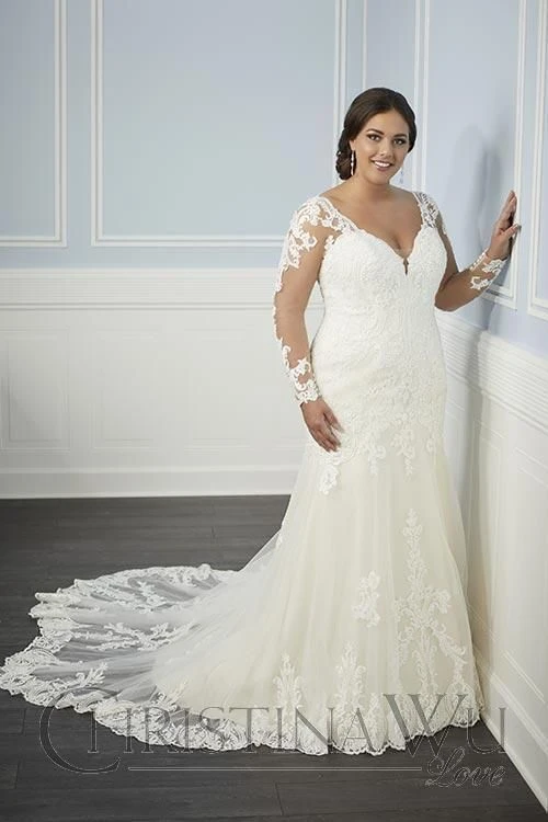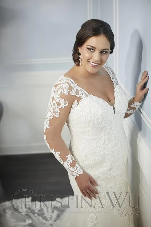 This Christina Wu Love 29342 trumpet-style plus size bridal gown features a low V-neckline, edged with illusion long sleeves that blend into the illusion back. Lace appliques coat the fitted bodice and scatter over the skirt, leading to a wide scalloped hem and a sheer chapel train.