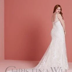 Christina Wu Love 29361 fit and flare plus size bridal gown is styled in allover lace, with illusion straps edging the V-neckline and low scoop back. Lace bands and floral motifs create a flattering silhouette, finished with covered back buttons and a semi-cathedral train.