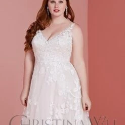 Christina Wu Love 29366 A-line plus size wedding gown is fashioned in lace-appliqued tulle, with a V-neckline, V-back, and pearl-beaded waist. This sleeveless bridal dress is finished with covered back buttons and a chapel train.