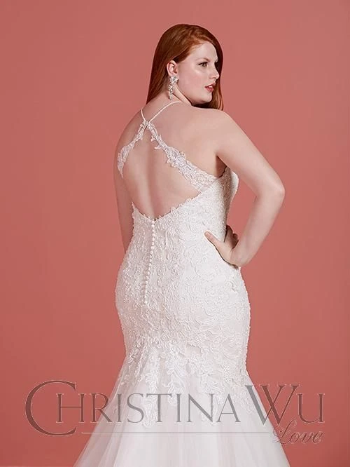 Christina Wu Love 29367 trumpet silhouette plus size bridal gown features a notched sweetheart neckline, and spaghetti straps that form the cross back. Beaded lace appliques stretch from the bodice to the drop waist, giving way to the tulle skirt and horsehair hem. Covered back buttons point to the chapel train.