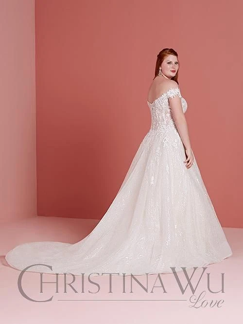 Christina Wu Love 29369 A-line plus size wedding dress is styled in sequin tulle over lace, with an off-the-shoulder sweetheart neckline and back buttons. Beaded floral appliques lend texture to this romantic bridal gown, finished with a semi-cathedral train.