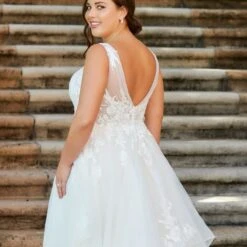 Christina Wu Love 29383 A-line plus size wedding gown is styled in soft tulle, featuring a ruched bodice with a V-neckline and a low V-back. Floral lace appliques coat the semi-sheer bodice, and scatter dramatically around the flounce skirt and chapel train. Covered buttons trim the back zipper.
