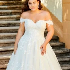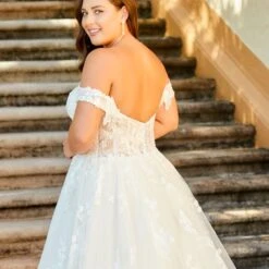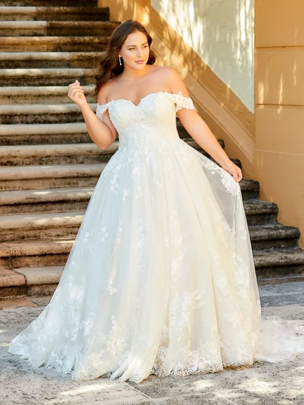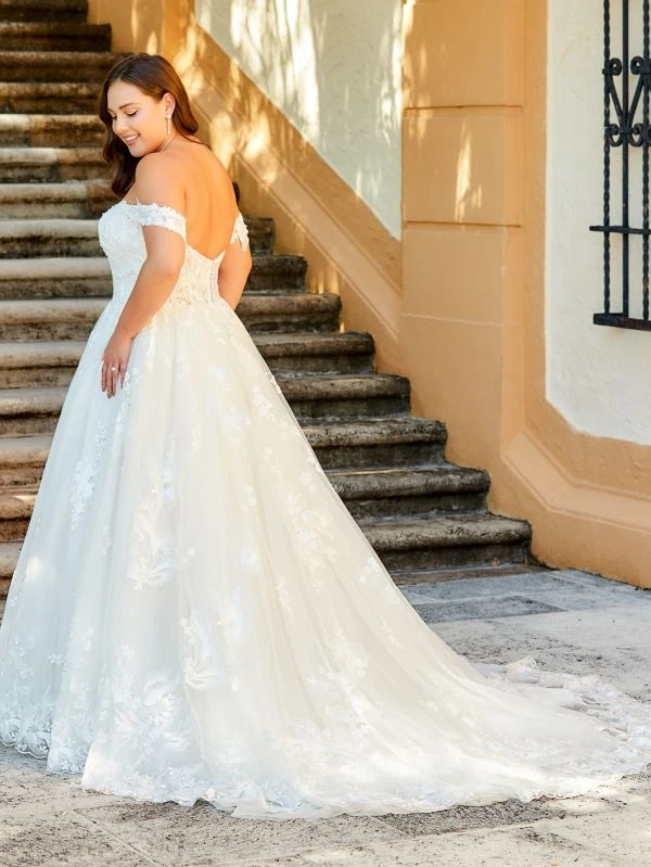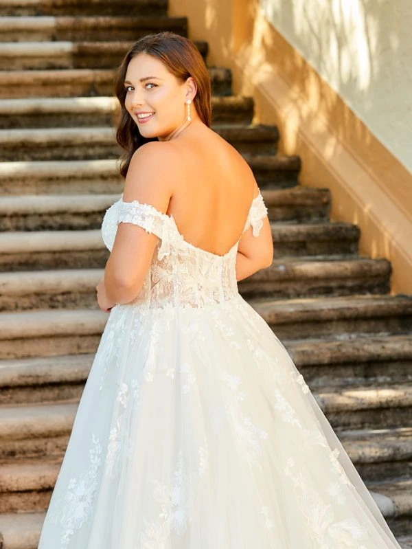 Christina Wu Love 29387 A-line plus size wedding gown is styled in lace and tulle, with detachable off-the-shoulder straps edging the sweetheart neckline. Tonal beads add glitz to this flattering bridal dress, finished with a scalloped hem and chapel train. Corset boning and covered buttons detail the low illusion back.