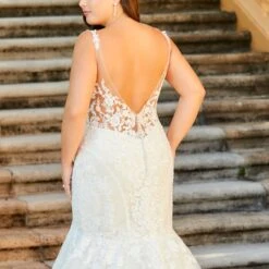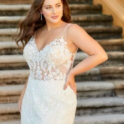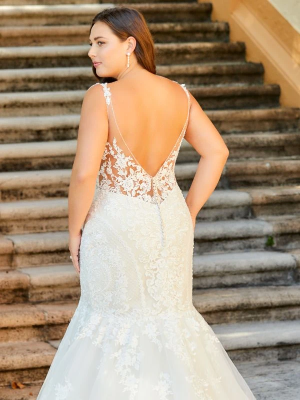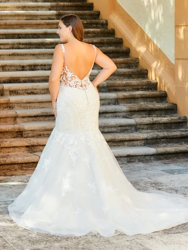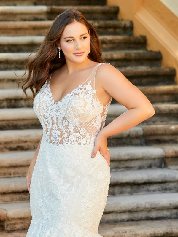 Christina Wu Love 29389 trumpet silhouette plus size wedding dress features a sheer bodice with crystal trims along the V-neckline, straps and low V-back. Lace appliques richly embellish this tulle bridal gown, jazzed up with tonal beads and lattice paneling. Covered back buttons point to the horsehair hem and chapel train.