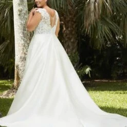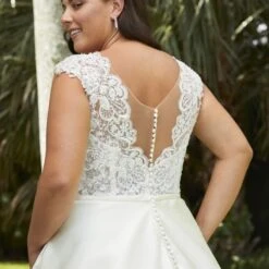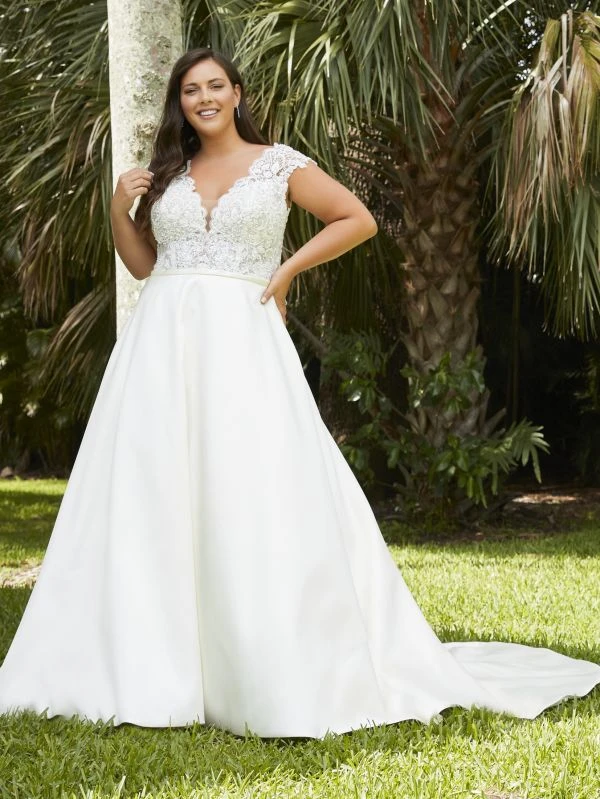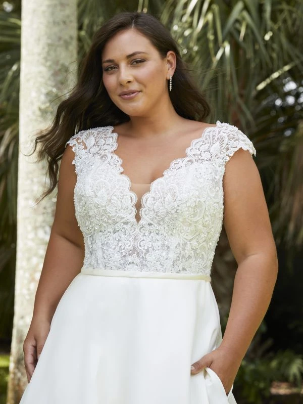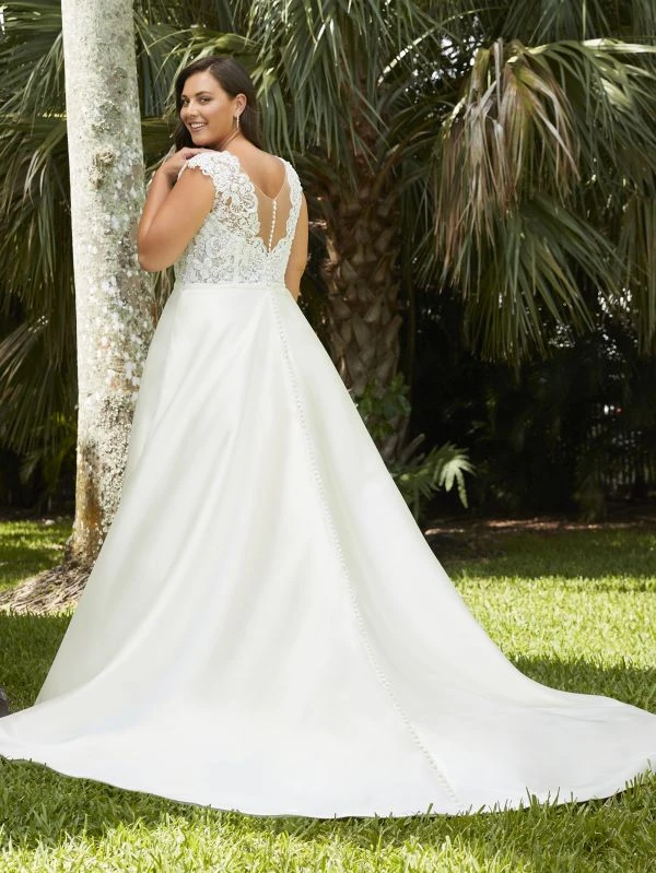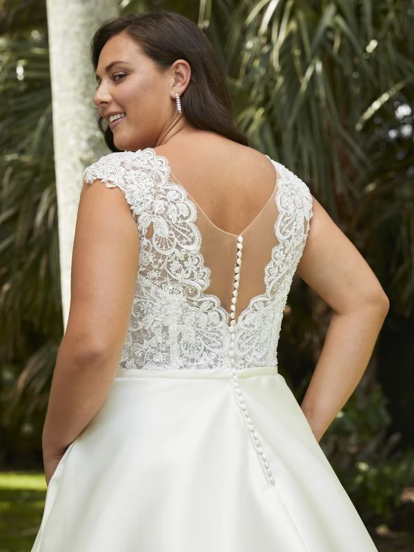 Christina Wu Love 29397 A-line plus size wedding gown features a beaded lace bodice over a mikado ball skirt, with a scalloped V-neckline and cap sleeves. Covered buttons trail down the illusion back to the chapel train, finished with a thin waistband and side pockets.
