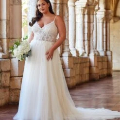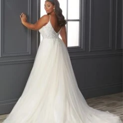 Christina Wu Love 29410 A-line plus size bridal dress features a sheer corseted bodice with a shallow V-neckline, beaded spaghetti straps and a low V-back. This sparkly wedding gown is fashioned in soft tulle over glitter tulle, finished with covered back buttons and a court train.