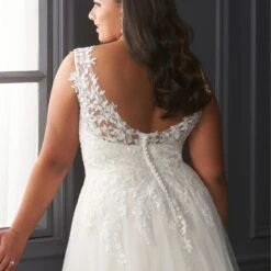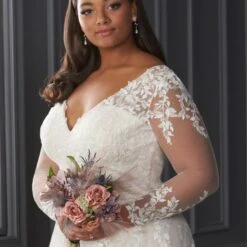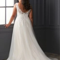 Christina Wu Love 29418 A-line plus size wedding dress features a beaded lace-appliqued bodice with a V-neckline, illusion straps and a low V-back. This soft tulle bridal gown exits with covered back buttons that extend to the court train. The removable illusion long sleeves create a second look.