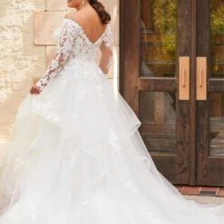 Christina Wu Love 29425 A-line plus size bridal dress features a semi-sheer lace bodice with an off-the-shoulder plunging neckline and long sleeves. Lace appliques richly embellish this tulle wedding gown, finished with a flounce ball skirt with horsehair edging and chapel train. Covered buttons accent the V-back.