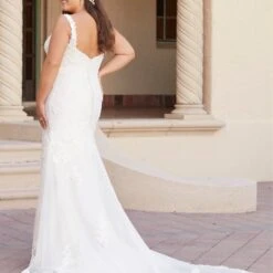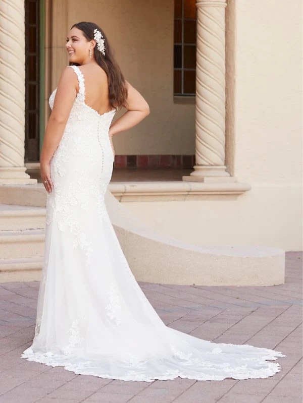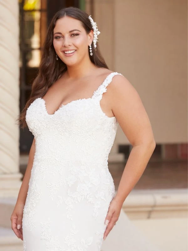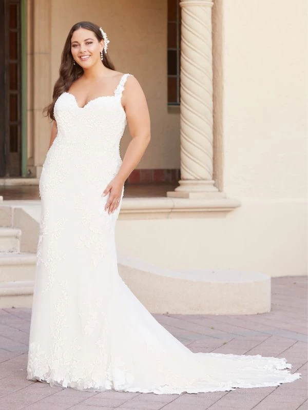 Christina Wu Love 29426 slim-flare plus size bridal gown is fashioned in allover lace and sparkle tulle, with a sweetheart neckline and lace straps. This romantic wedding dress exits with covered buttons on the mid-rise back and a scalloped semi-chapel train.