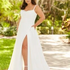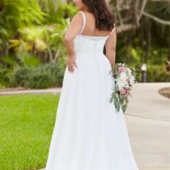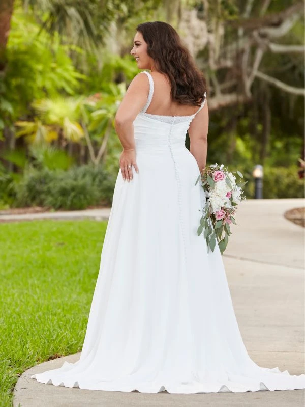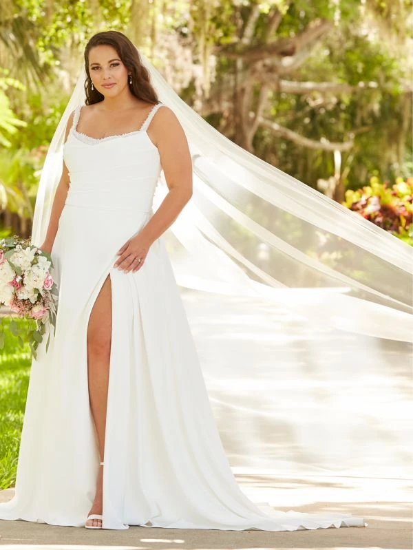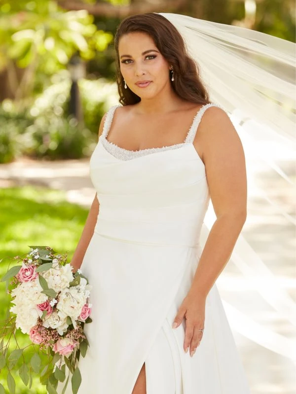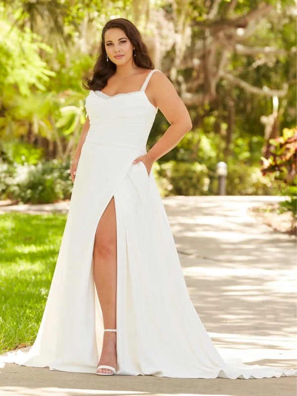 Christina Wu Love 29427 A-line plus size wedding gown features a pleated bodice with beaded trim on the curved neckline, slim straps and square back. A crossover skirt with a thigh-high slit and side pockets add flair to this crepe satin bridal dress, finished with covered back buttons and a court train.