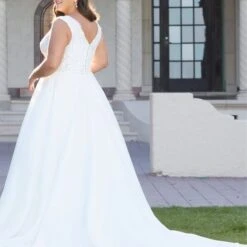 Christina Wu Love 29433 A-line plus size wedding dress features a corseted lace bodice over an organza ball skirt, with a V-neckline and V-back. Covered buttons trail down the back to the chapel train.