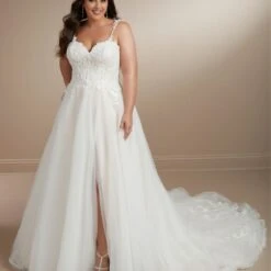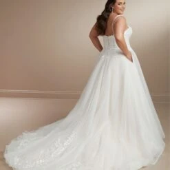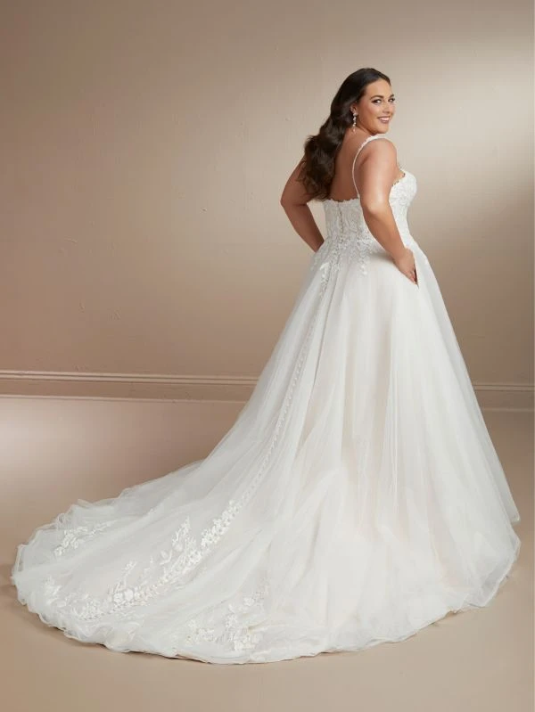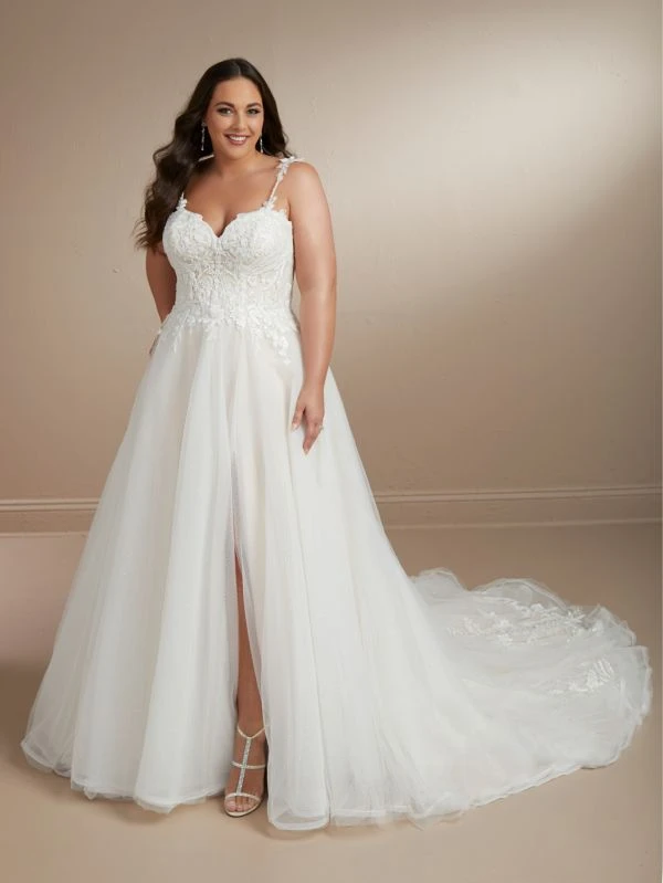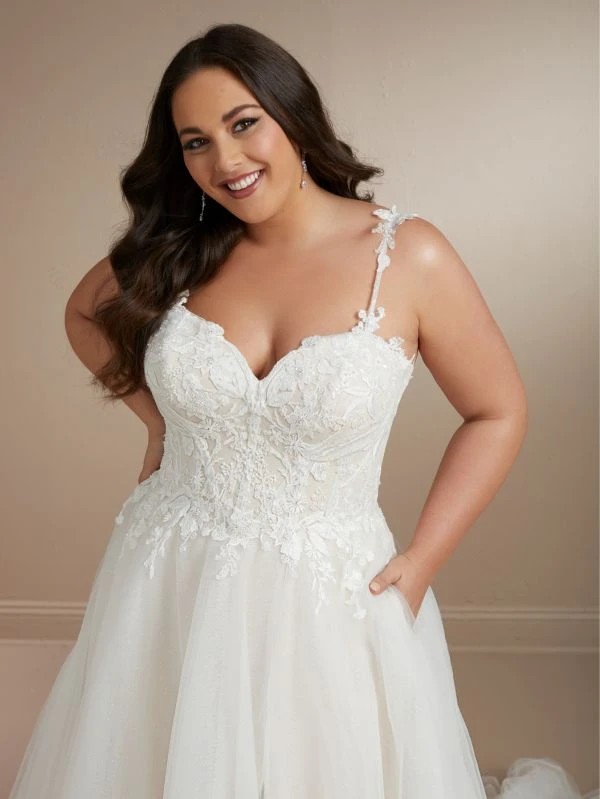 Christina Wu Love 29440 A-line plus size bridal dress features a corset bodice with a sweetheart neckline, lacy spaghetti straps and a mid-rise back. Lace appliques embellish the bodice and the chapel train of this sparkle tulle wedding gown, jazzed up with back buttons down to the hem. This romantic look is completed with side seam pockets and an off-center slit.