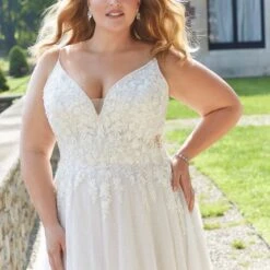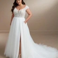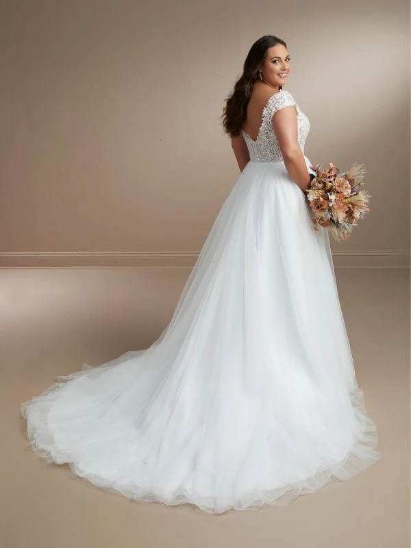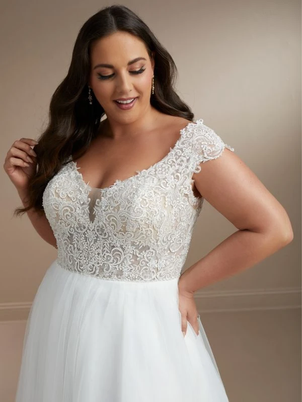Christina Wu Love 29446 A-line plus size wedding gown features a lace bodice with a notched scoop neckline, mini cap sleeves and a low V-back with buttons. The beaded waist gives way to the voluminous tulle skirt, finished with a high front slit, side pockets, and a chapel train.
