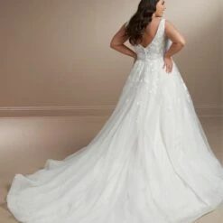 Christina Wu Love 29447 A-line plus size bridal gown is styled in tulle over glitter net, featuring a ruched top with a V-neckline and a low V-back with buttons. Beaded floral appliques from the bodice to the topskirt add texture to this sparkly wedding dress, finished with a ruched waistband and a chapel train.