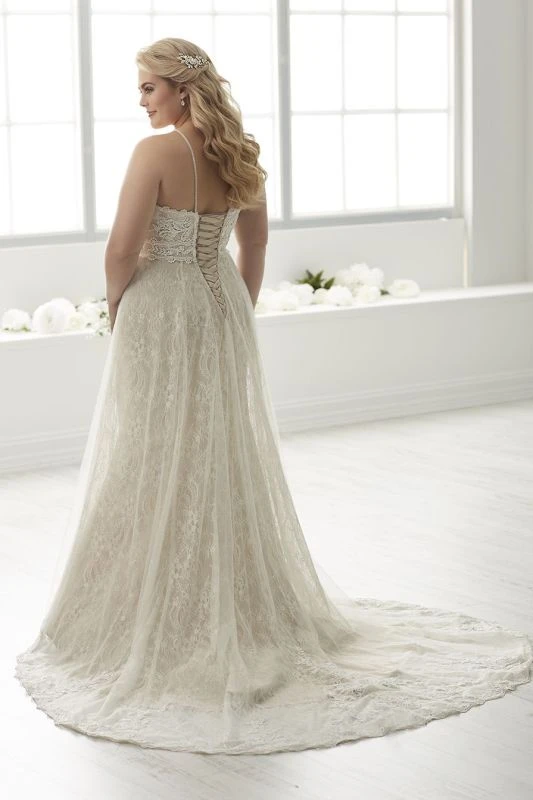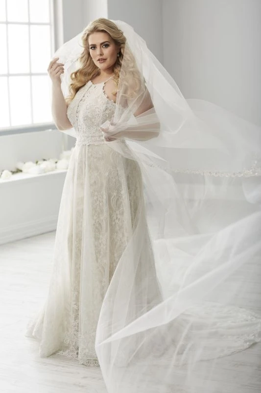 Styled in ivory lace embellished with delicately beaded lace appliques, this Christina Wu Love 29314 sleeveless wedding dress creates an A-line silhouette. An illusion keyhole accents the bodice of this plus size gown with a jewel neckline. Beaded spaghetti straps lead into the lace-up back and a lace applique border hemline completes the skirt and court train.