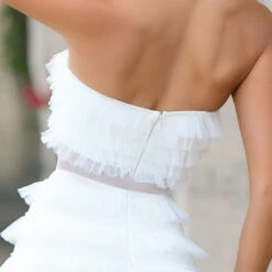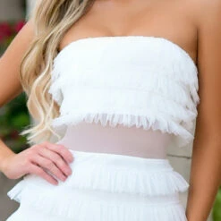 In a ruffle? Keep the vibes fun, flirty and a little dramatic with our Georgia Mini Dress! This strapless mini has a fitted sheer bodice with a tierd tulle skirt. It’s a statement party number that’ll have you feeling like the main character. Seriously. Just team it with a pair of strappy heels and a clutch for a showstopping finish for your next night out! Also comes in black, blush and smokey blue!