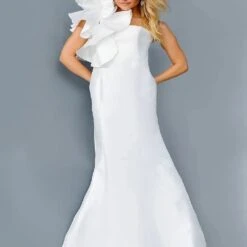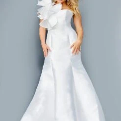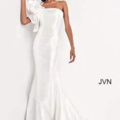 JVN by Jovani JVN00650 fuchsia formal gown features a form-fitting silhouette in mikado, with a statement ruffle strap edging the one-shoulder neckline. Princess seaming contours this slim prom dress, finished off with a semi-chapel train.