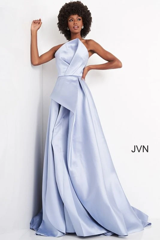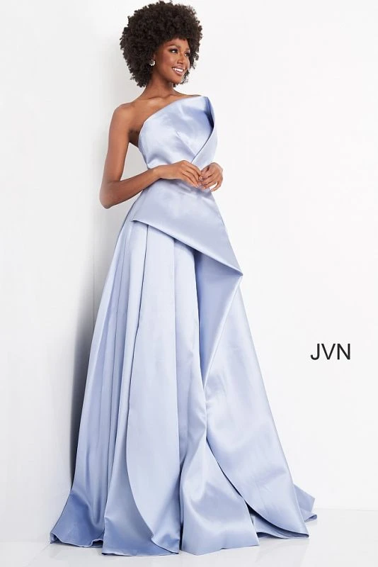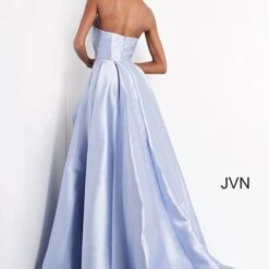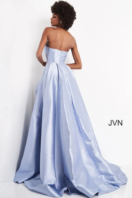 JVN by Jovani JVN03147 light blue prom dress features a strapless A-line silhouette with a stylish crumbcatcher neckline that complements the pleated skirt. This mikado formal gown exits with a semi-open back and a court train.