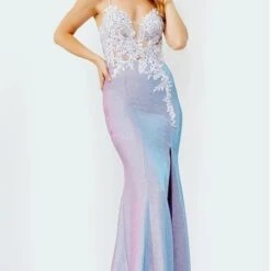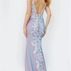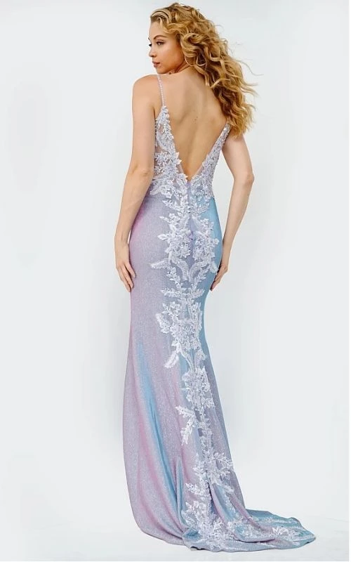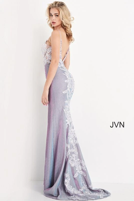 JVN by Jovani JVN06454 lilac prom dress features a beaded embroidered illusion bodice with a deep sweetheart neckline, spaghetti straps and open V-back. Completing this fitted formal gown is a shimmer skirt with a left-leg slit, jazzed up with waterfall appliques along the back to the sweep train.
