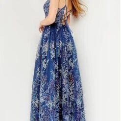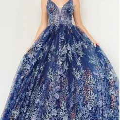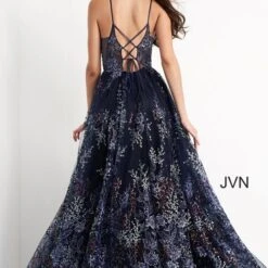 JVN by Jovani JVN06457 navy blue formal gown features a sheer bodice with an illusion plunging neckline, beaded spaghetti straps and lace-up back. This A-line long dress is crafted in beaded floral mesh and finishes in a fully gathered skirt.