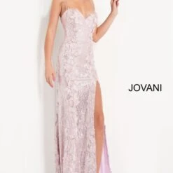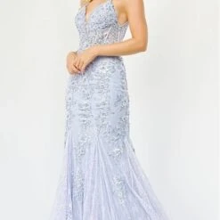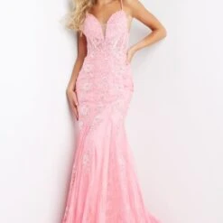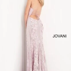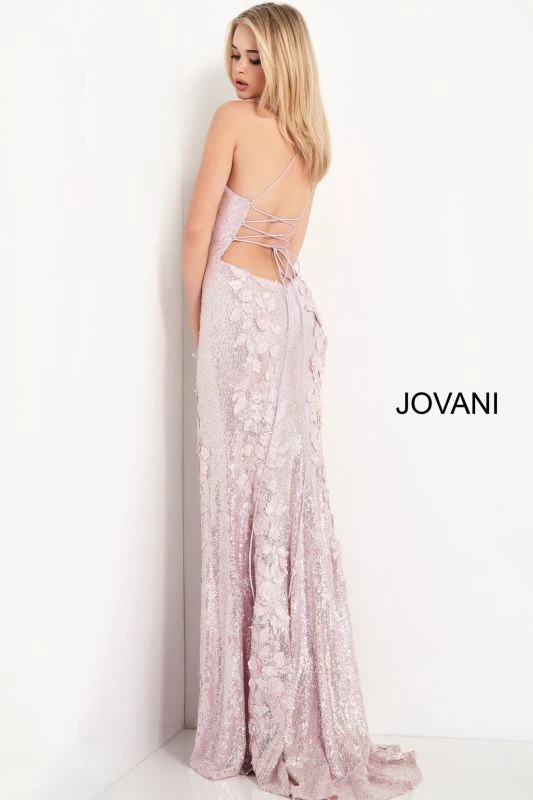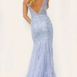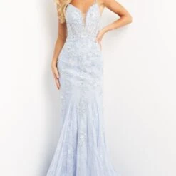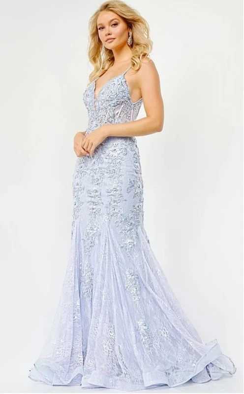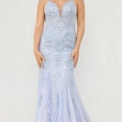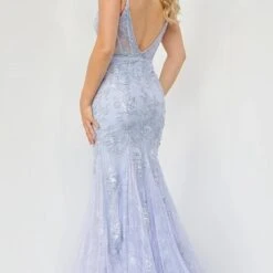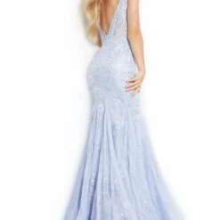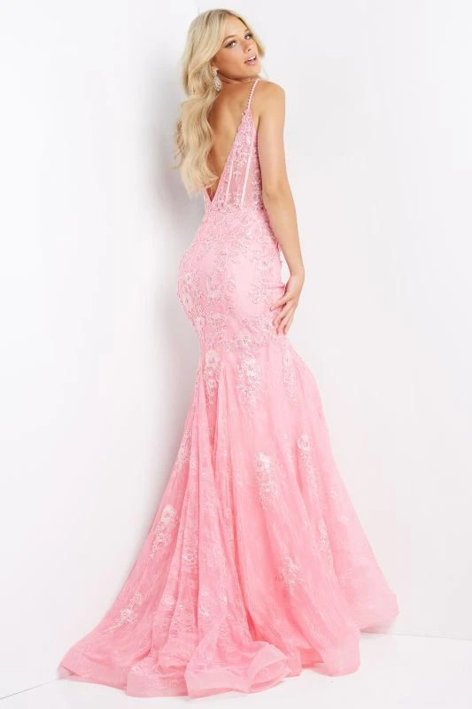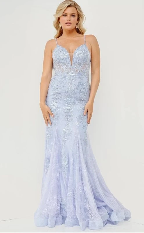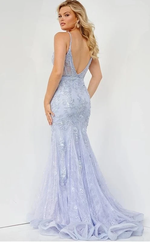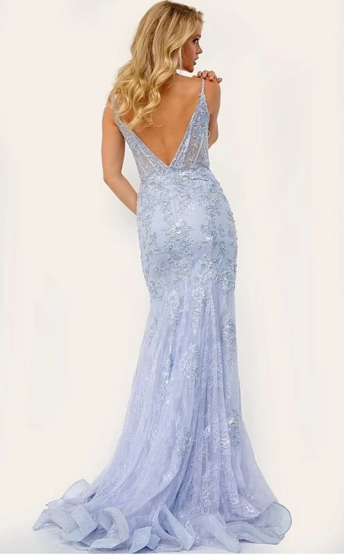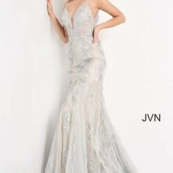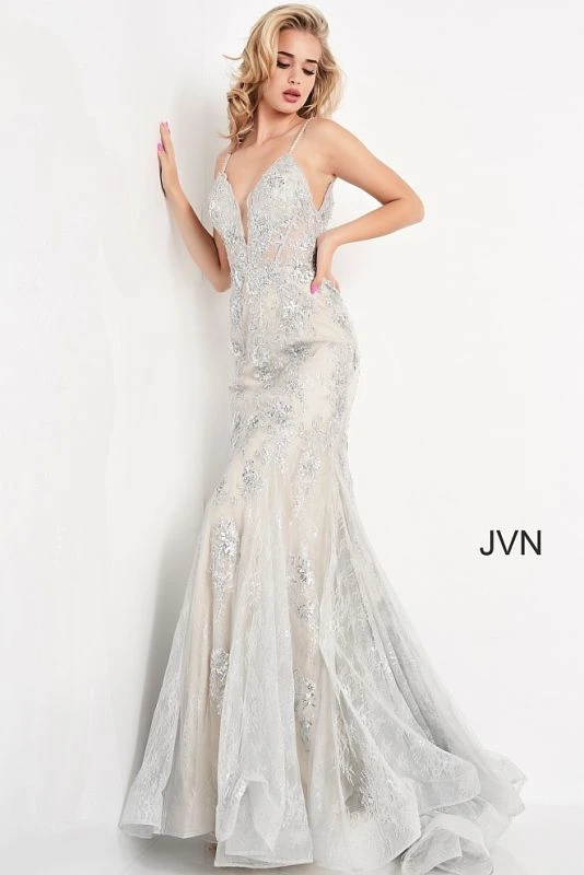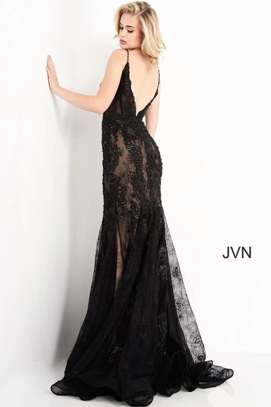 JVN by Jovani JVN06475 black nude formal gown is styled in embroidered tulle over lace, with a plunging neckline, beaded spaghetti straps, and open V-back. This fit and flare long dress finishes in a godet skirt that flows to a horsehair hem and sweep train.