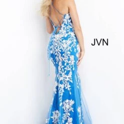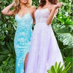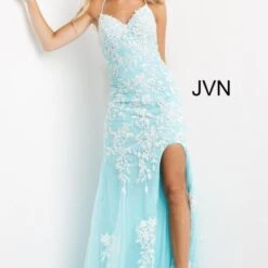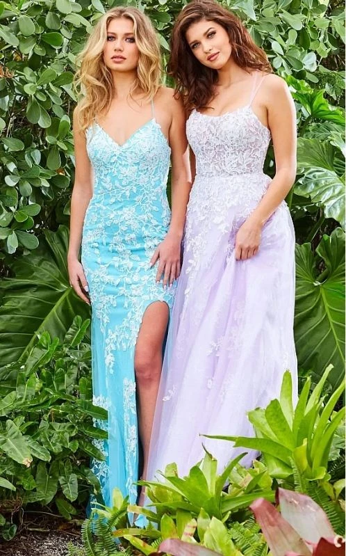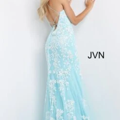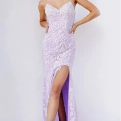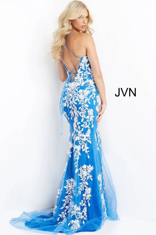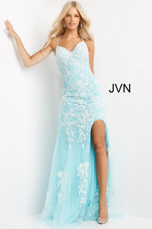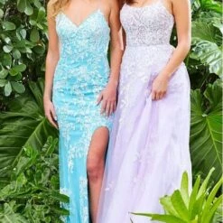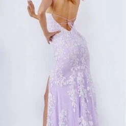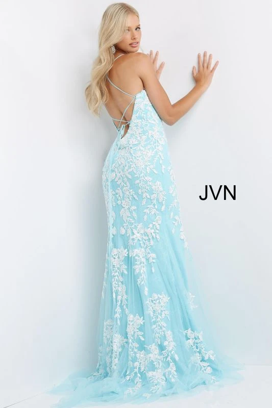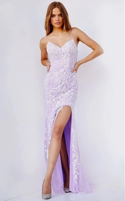 JVN by Jovani JVN06660 lilac white prom gown features a slim silhouette with a sweetheart neckline and spaghetti straps that lace-up at the open back. A thigh-high slit accents this fitted formal dress, finished off with a sweep train.