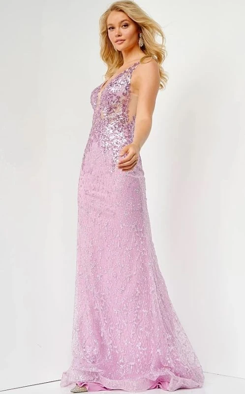 JVN by Jovani JVN08418 fuchsia long party dress is styled in shimmer net over a solid lining, jazzed up with patterned sequins along the bodice. The semi-sheer top is detailed with a mesh insert plunging neckline, sheer plunging sides and a plunging V-back. This fitted prom gown finishes in a horsehair hem and a sweep train.