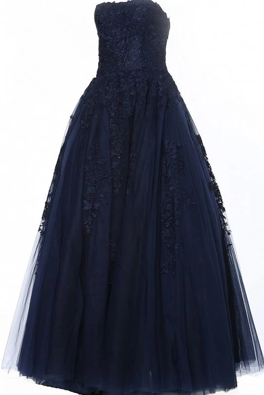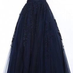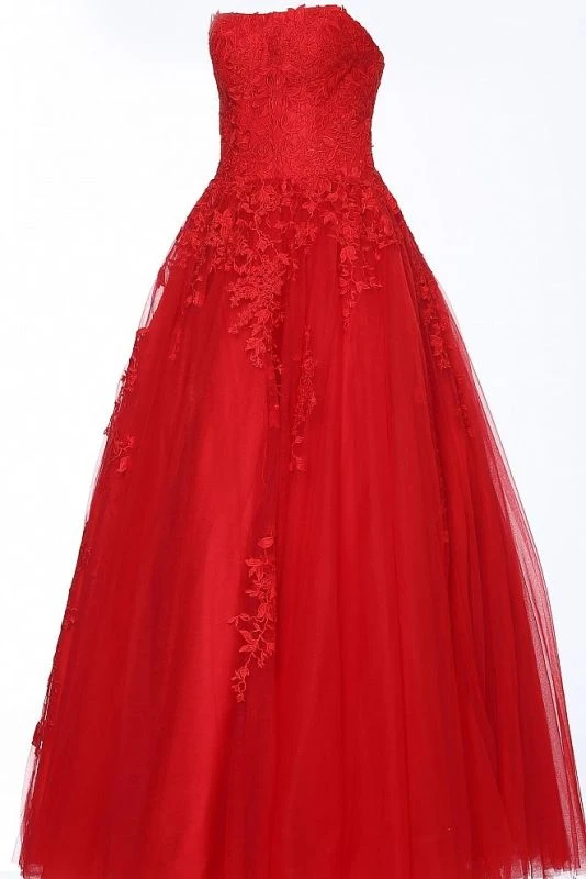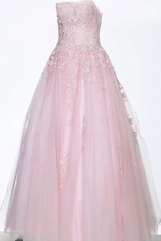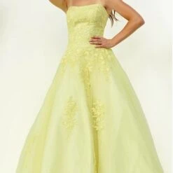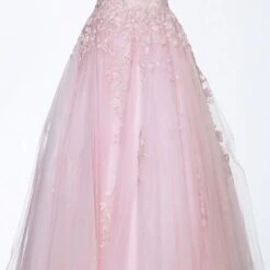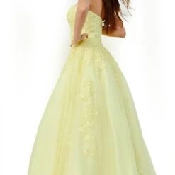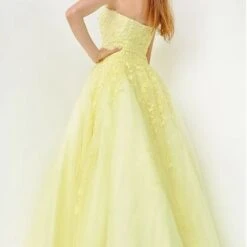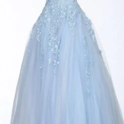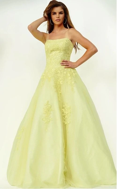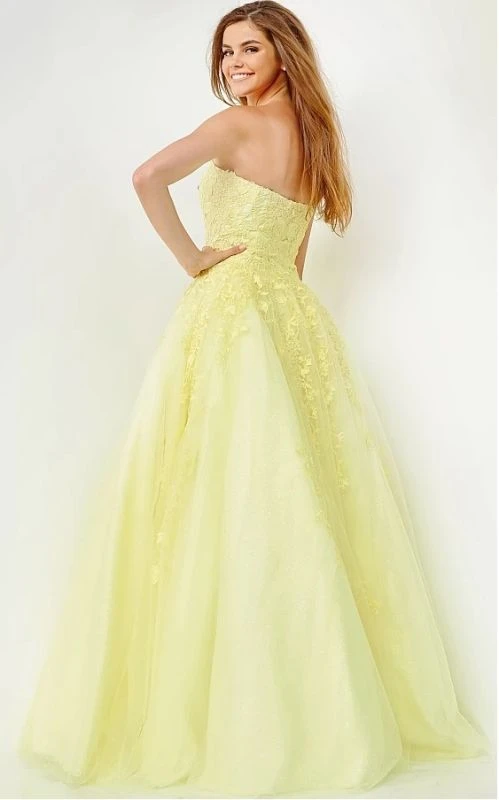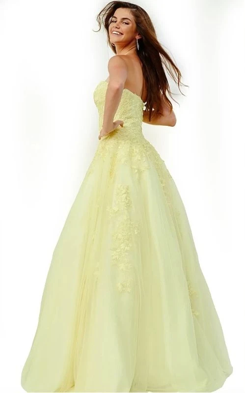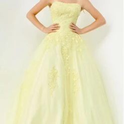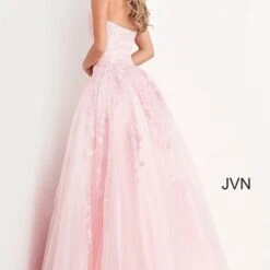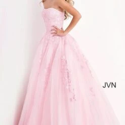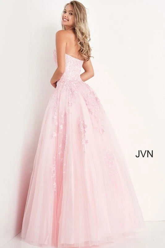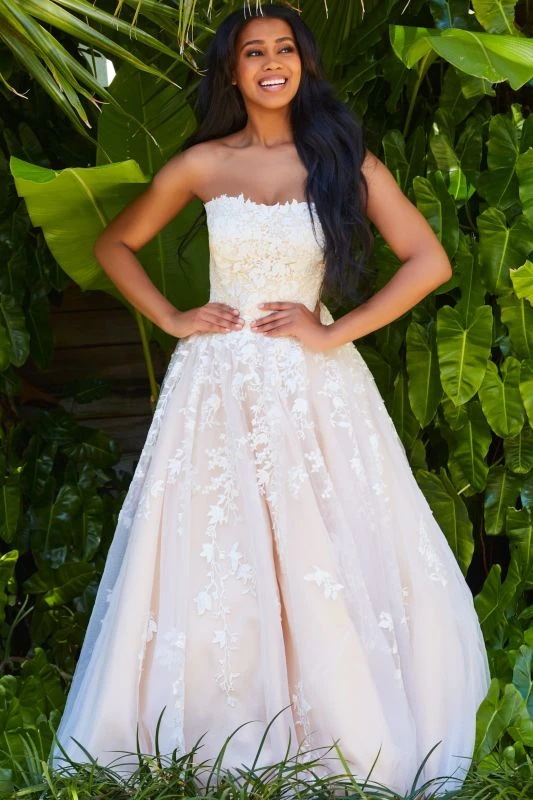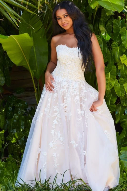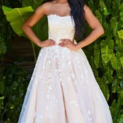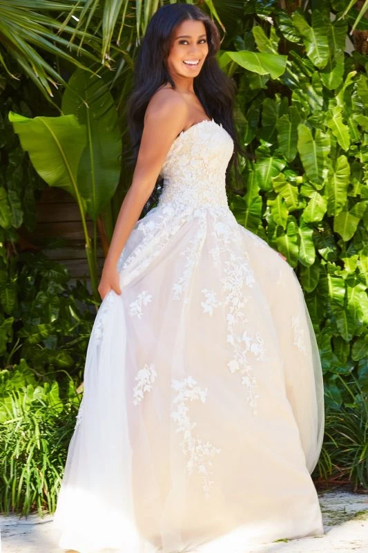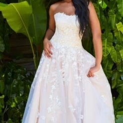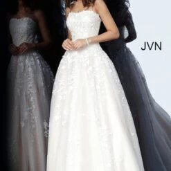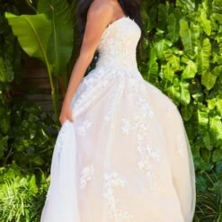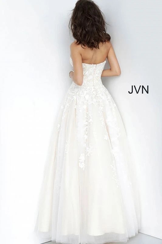 JVN by Jovani JVN1831 off white prom gown features an A-line silhouette in embroidered tulle over a solid lining, with a subtly curved strapless neckline. The drop waist gives way to the gathered ballgown skirt.
