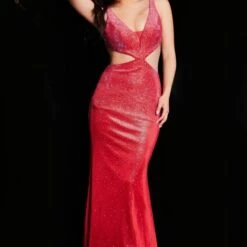 JVN by Jovani JVN23098 fitted long party dress in shimmer satin features a plunging V-neckline and daring midriff cutouts that blend into the cutout back. Heat-set stones luxuriously embellish this trendy prom gown, finished with a slight brush train.
