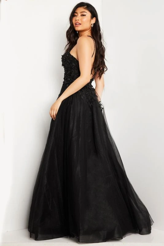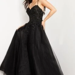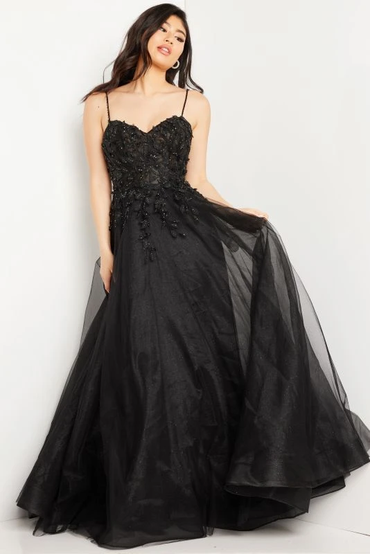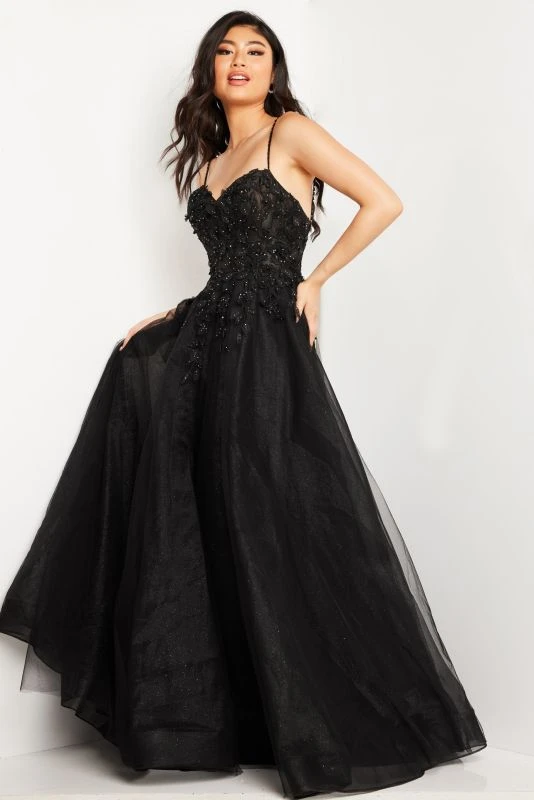 JVN by Jovani JVN25825 prom dress features a semi-sheer bodice in beaded embroidery and 3D flowers, with a sweetheart neckline and beaded spaghetti straps. The strappy open back adds flair to this glitter tulle A-line gown, finished with a horsehair hem and brush train.