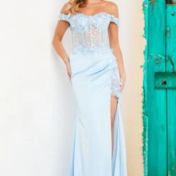 JVN by Jovani JVN25907 formal dress features an illusion corset bodice in beaded embroidery and 3D flowers, with an off-the-shoulder neckline and mid-rise back. The sky-high slit with an embellished inset on the draped satin skirt adds flair to this slim-fit prom gown, finished off with a sweep train.