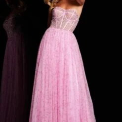 JVN by Jovani JVN36477 A-line prom gown in floral print glitter tulle features a sheer corset bodice with a strapless sweetheart neckline and a low-rise back. Pearls and crystals richly embellished this trendy formal dress, finished with a fully gathered skirt.