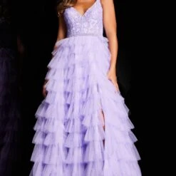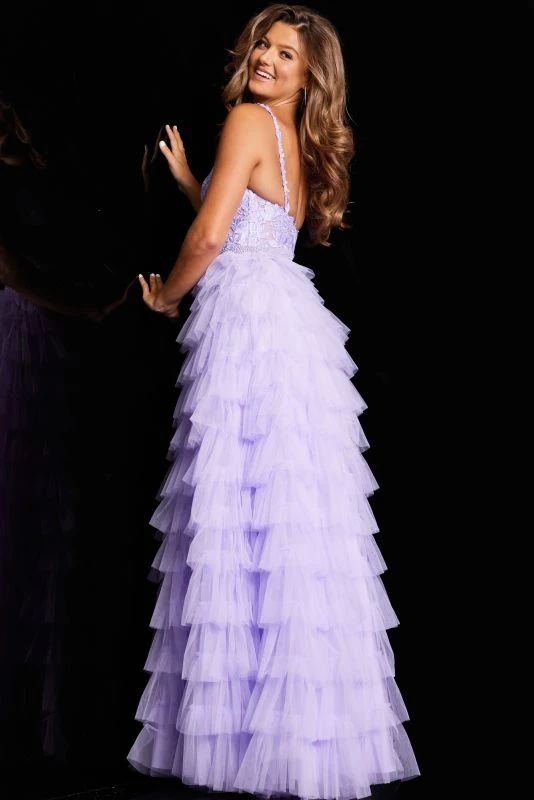 JVN by Jovani JVN37001 prom ballgown features a semi-sheer corset bodice in floral lace, with a V-neckline, spaghetti straps, and a low zipped-up back. A beaded belt tops the multi-tiered ruffle tulle skirt.