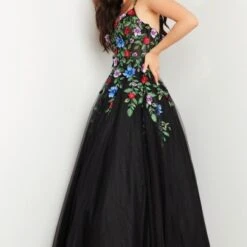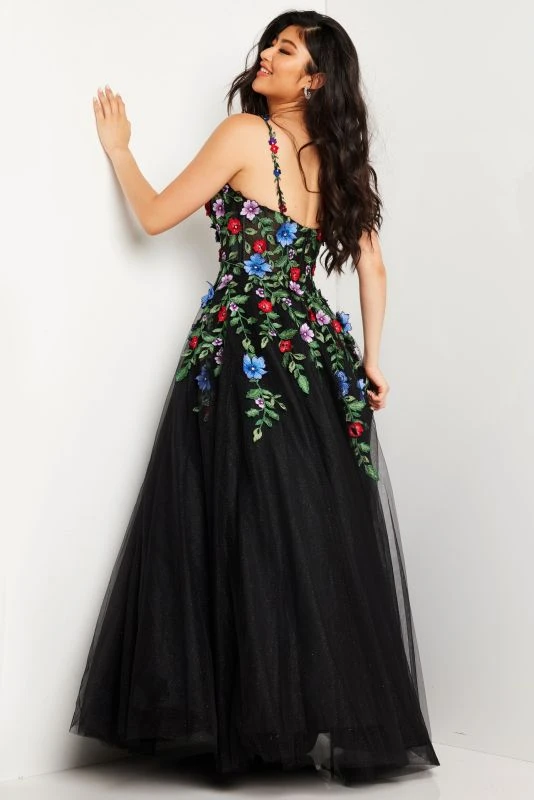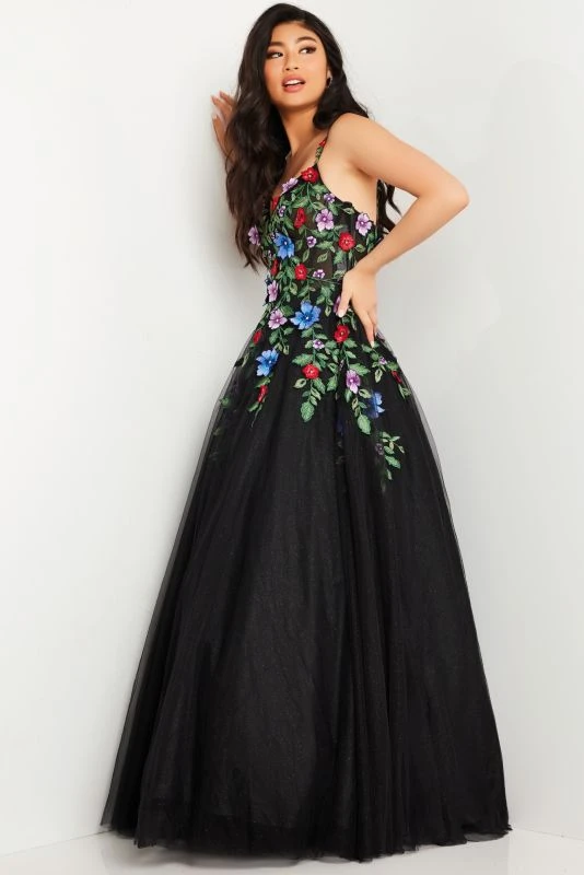 JVN by Jovani JVN37489 black prom ballgown features a sheer corset bodice with a sweetheart neckline, lacy spaghetti straps and a low illusion back. Beaded floral embroidery from the bodice to the topskirt adds color and style to this glitter tulle formal dress.