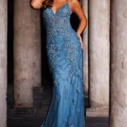 JVN by Jovani JVN37595 slim-fit prom dress in glitter tulle features a sheer bodice with a V-neckline, spaghetti straps and a low illusion back. Metallic floral embroidery luxuriously embellished this sparkly formal gown, finished with an eyelash-scalloped hem and a sweep train.