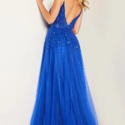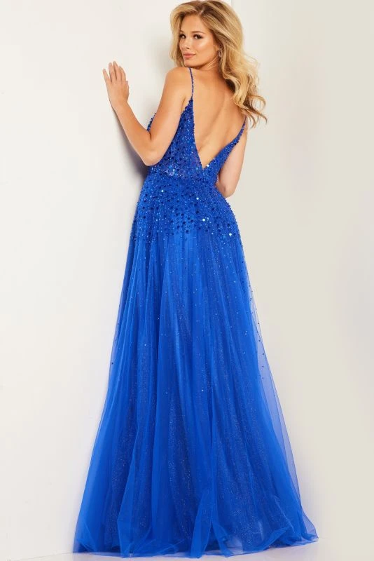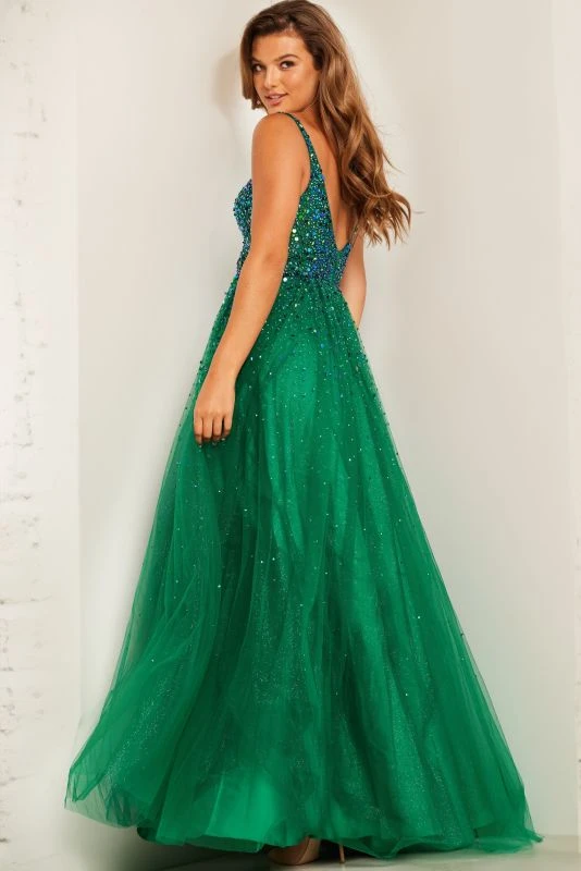 JVN by Jovani JVN38437 A-line prom dress is fashioned in glitter tulle, with a low V-neckline, beaded spaghetti straps, and an open V-back. Beads and sequins luxuriously embellish this sparkly formal gown, ending in a sweep train.