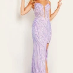 JVN by Jovani JVN38661 fitted prom gown in novelty sequin mesh features a sheer corset bodice with a narrow plunging neckline and double spaghetti straps. Floral embroidery appliques add style and texture to this sparkly formal dress, finished with a cutaway front slit, horsehair hem, and sweep train.