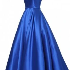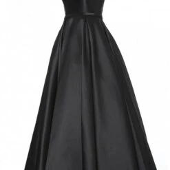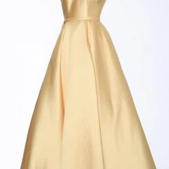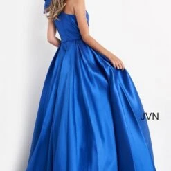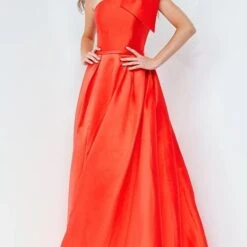 JVN by Jovani JVN4355 red mikado prom gown features an A-line silhouette with asymmetrical one-shoulder neckline, edged with a statement bow applique. A slim fabric waistband tops the pleated long skirt, finished with in-seam pockets.
