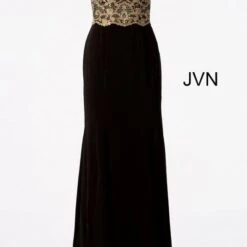 This JVN Prom by Jovani JVN66059 black formal dress features an embroidered illusion bodice, with beaded spaghetti straps edging the sweetheart neckline and low back. Matching metallic embroidery appliques form the waterfall back, completing this slim-flare gown with a slight brush train.