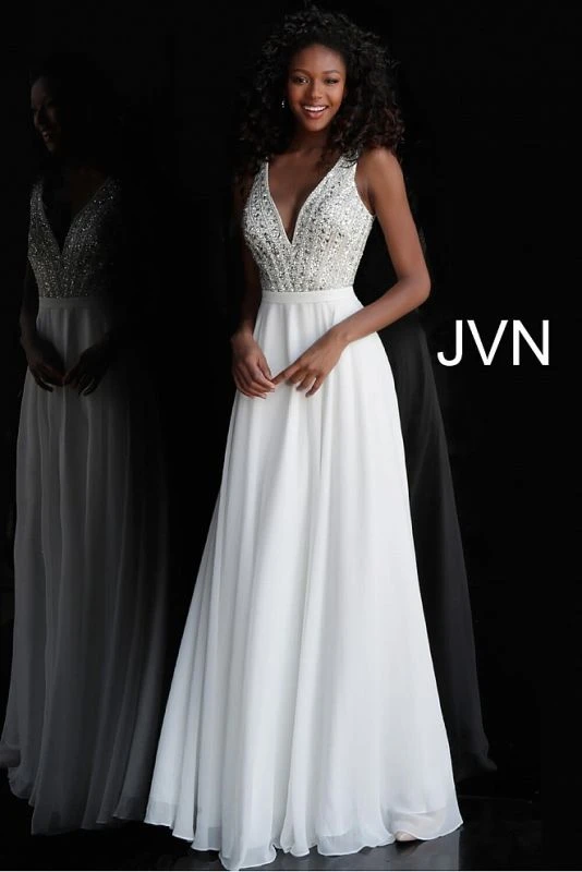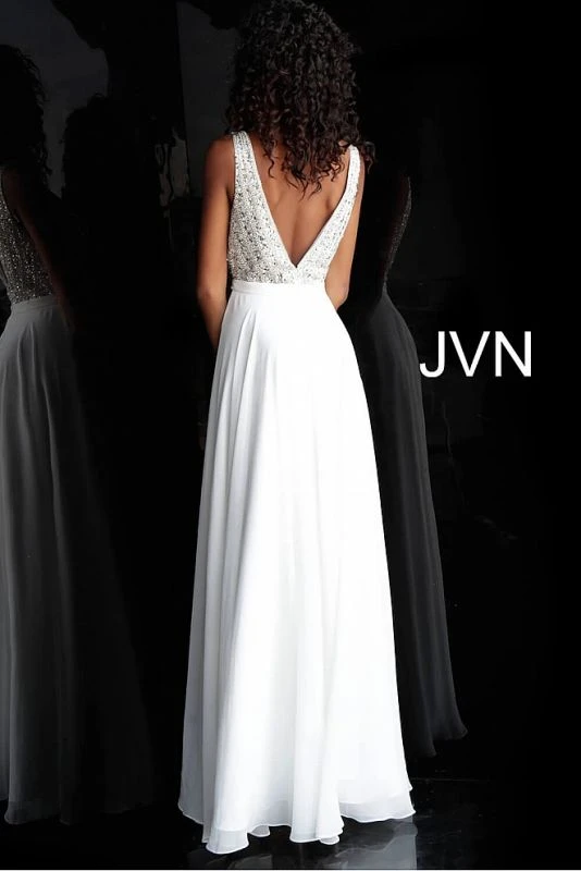 JVN by Jovani JVN67285 white prom dress features a linear beaded bodice over an A-line chiffon skirt, with a deep V-neckline and a plunging V-back. A slim waistband cinches this sleeveless formal gown.