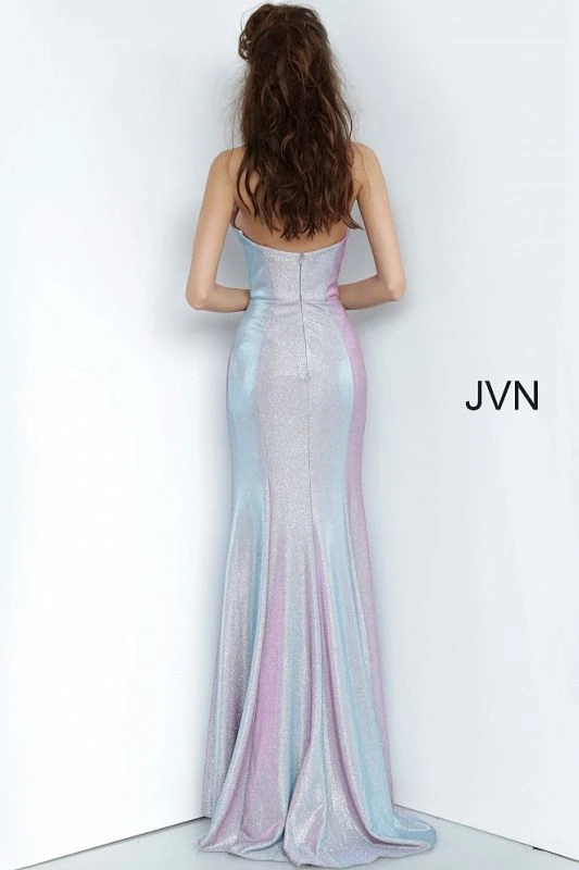 JVN by Jovani JVN68190 lilac prom dress features a form-fitting silhouette in shimmer fabric, with a strapless sweetheart neckline and brush train. Front and back princess seaming complements the seamed waist.