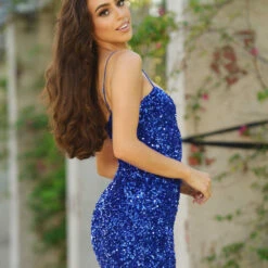 The Juliette mini in Cobalt Blue is a stretch velvet fabric covered and embellished with sequins throughout; giving you an hourglass bodycon fit. This glam mini dress is perfect for your next special occasion; rule the night by pairing the Juliette with a cute clutch and strappy heels; perfect as a homecoming dress, semiformal dress or for a night on the town!