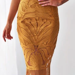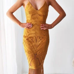 The Khaleesi Dress in Mustard is a gorgeous lace midi dress with fringe detail. This lace up back dress will compliment your curves. The Khaleesi Dress is a stunning wedding guest dress for the summer or for other black tie occasions. Available in other colors on our website, Type “Khaleesi Dress” in the search bar to see all the other colors available to you Two Sisters the Label dresses