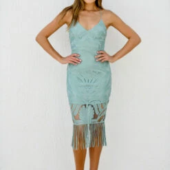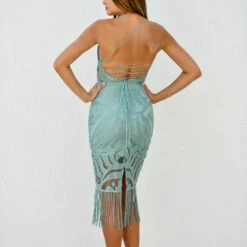 The Khaleesi Dress in SAGE is a stunning midi dress with a lace up back, a fringe tassel detail on the bottom. The Khaleesi is perfect for a wedding guest, black tie occasion, semiformal or homecoming, Two Sisters the Label Dress