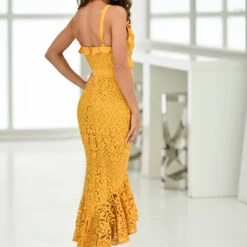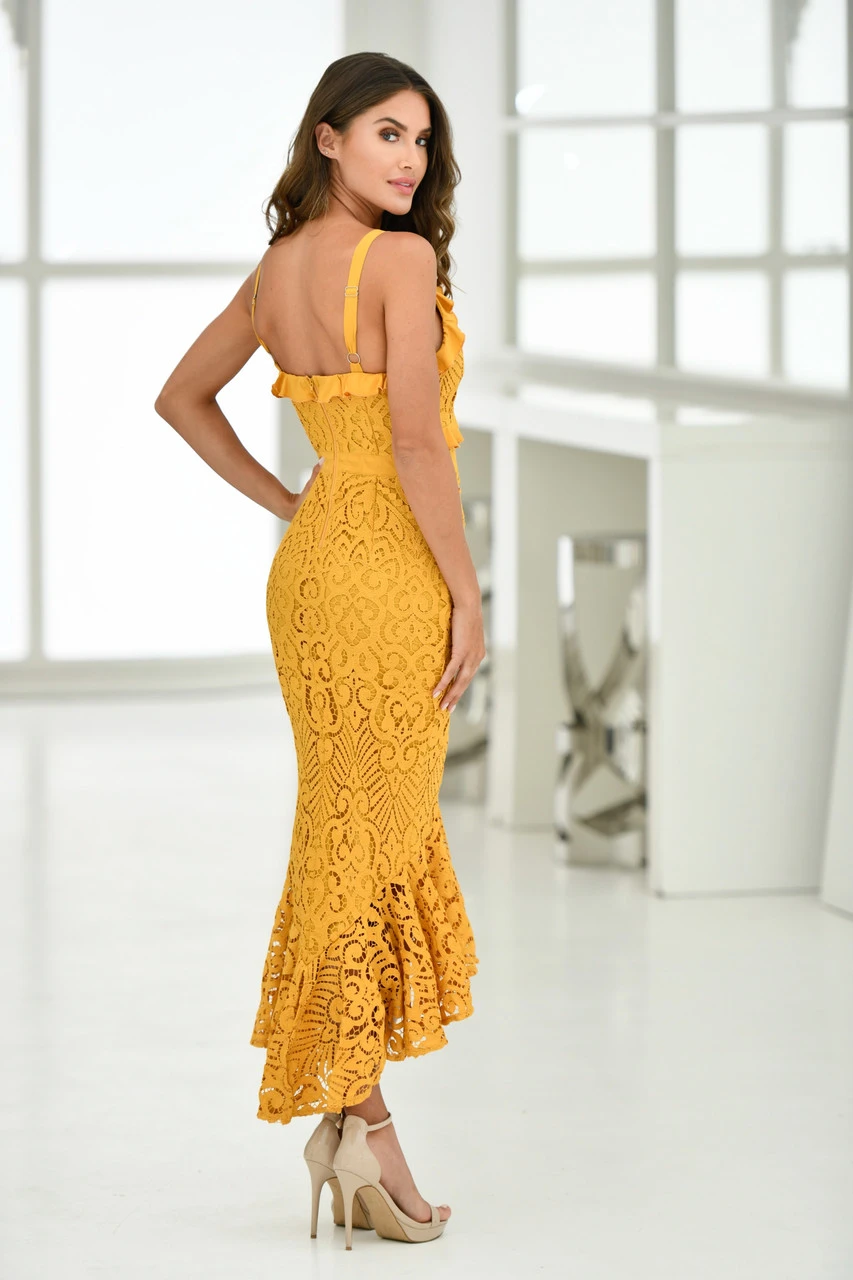 The Leanne Dress in Mustard is a stunning lace midi dress perfect for attending a wedding or a summer celebration.