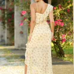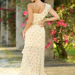 The Linnea Maxi Dress is your next statement dress of the season! This lightweight floral maxi is completed with a one strap ruffle ascending beautifully down the front. The ruffle skirt gives a high-low affect creating an elegant silhouette. Wear this dress at your next formal event, wedding, night /day out or any special occasion!