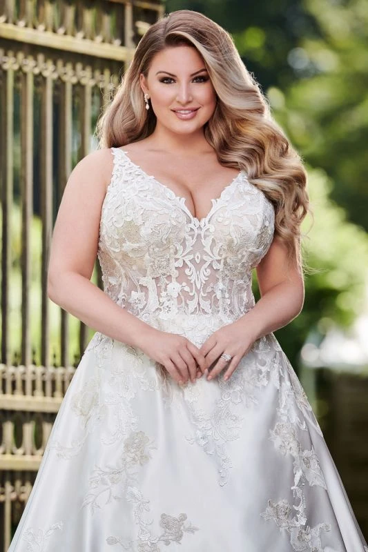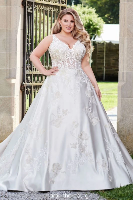 Martin Thornburg 120244W Cadence A-line plus size bridal gown features a corseted sheer bodice over a satin skirt, with allover metallic lace appliques. The V-neckline complements the V-back, finished with covered buttons that trail into the back-pleated skirt and chapel train. This sleeveless wedding dress has in-seam pockets and a separate bodice lining.